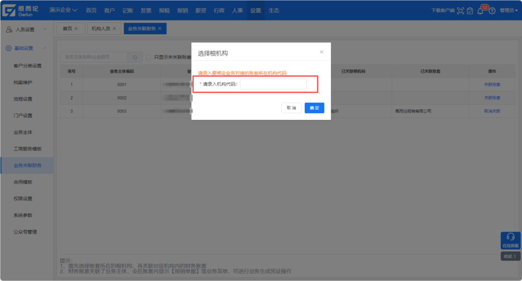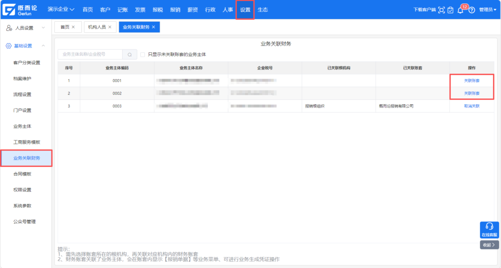操作步骤:机构管理员绑定“报销业务主体”与“财务账套”的关联关系