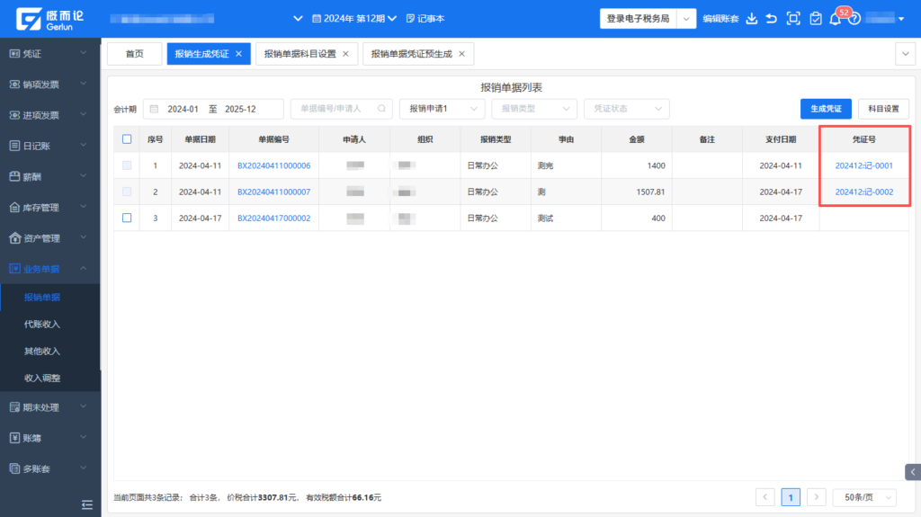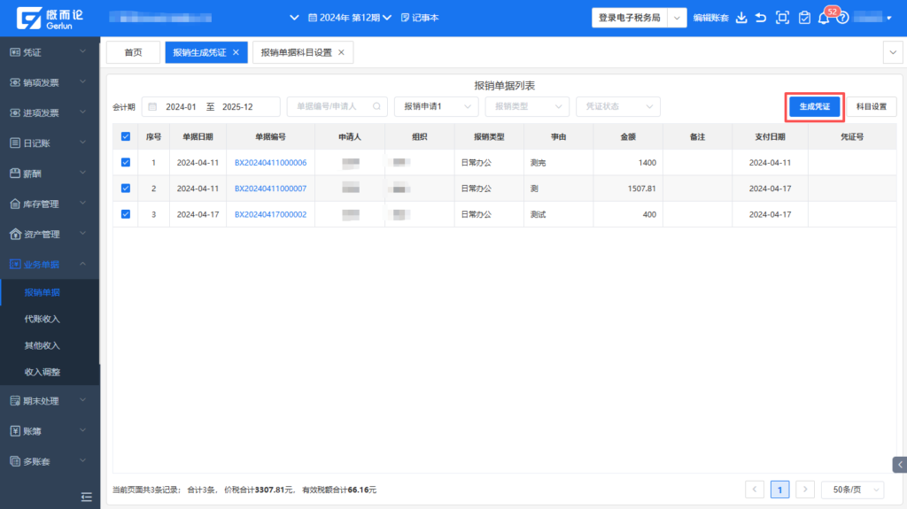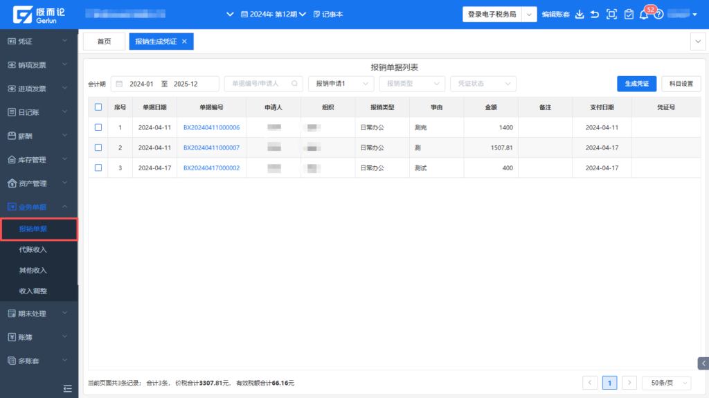 系统通过业务主体和账套的关联,将“报销申请“、“无票支付申请“、“代收代付”三类单据传递到账套内,并在账套中生成凭证。