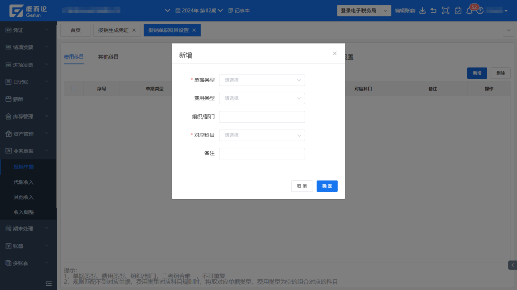 注:单据类型为“代收代代”,则无法下拉选择“费用类型”,只需设置单据对应科目即;