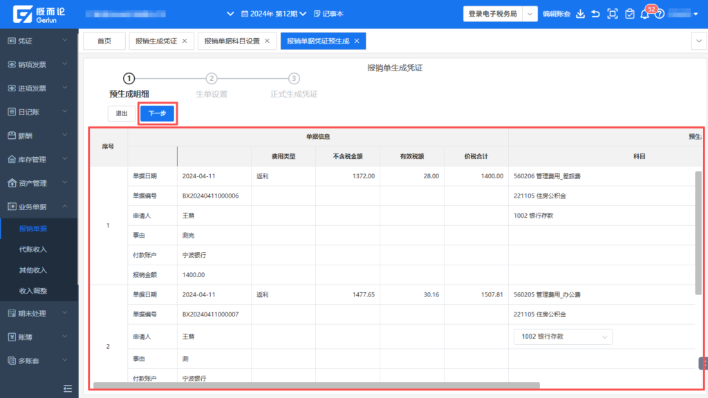 操作:选择报销单类型,选择要生成凭证的记录,点击右上角按钮【生成凭证】,进入生单向导指引