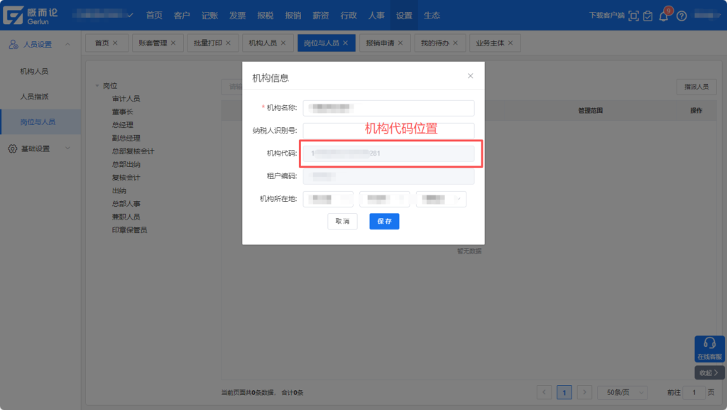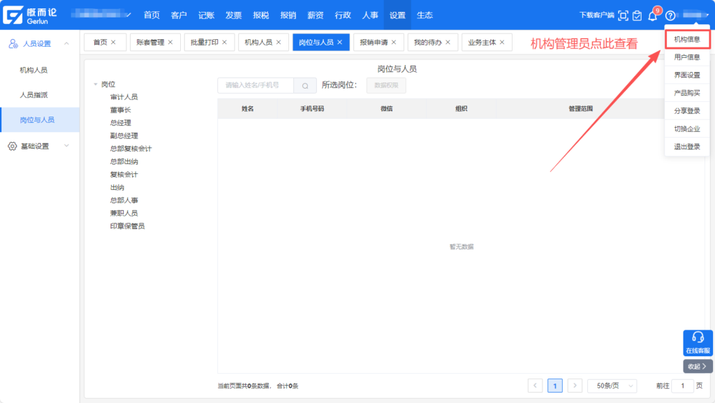 路径:系统页面右上角姓名下拉-【机构信息】