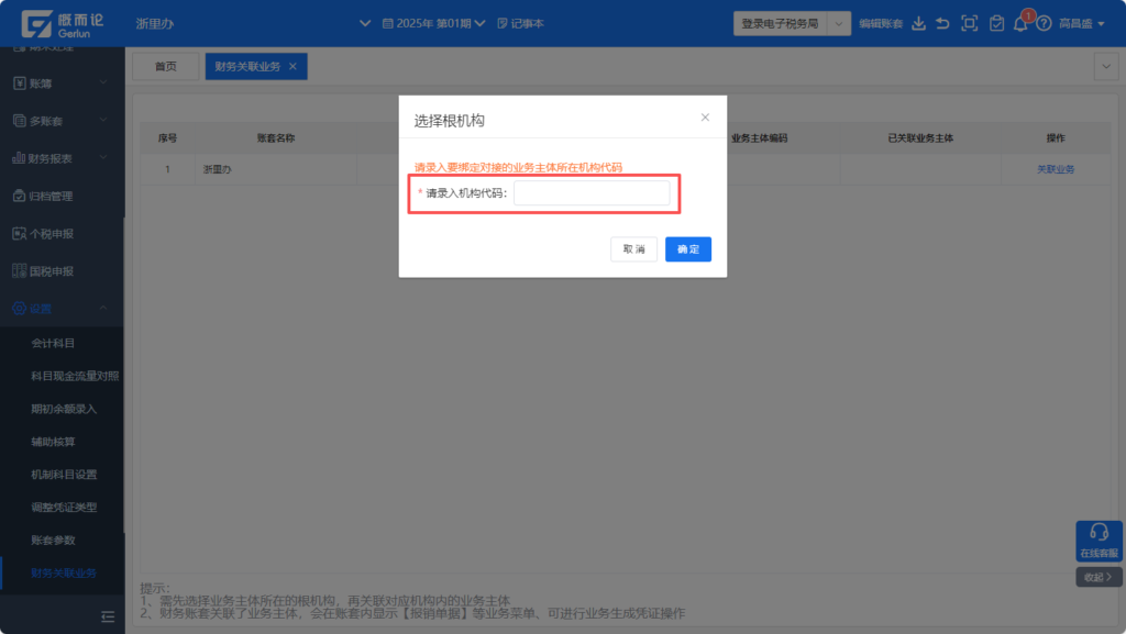 操作步骤:输入机构代码后,选择对应的业务主体并确认来完成绑定。