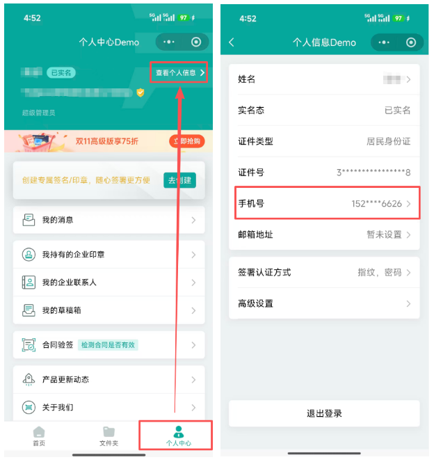 答:请确认发起时填写的签署人手机号,与当前操作人绑定的手机号一致,可以在腾讯电子签小程序个人中心,点击“查看个人信息”,确认绑定的手机号是否正确(若有误可以撤回后重新发起,或者让经办人重新绑定正确的手机号)。