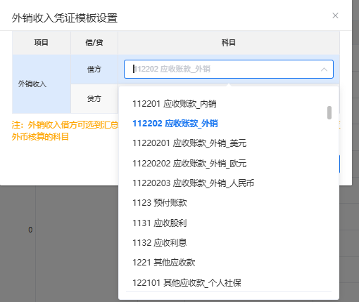 2、若外销收入借方科目下根据币种设多个下级科目,可选到该汇总科目,如下图,建议选到【112202应收账款_外销】科目