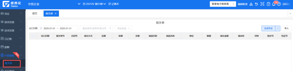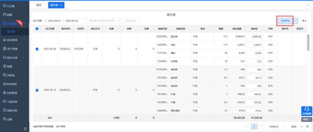 1、在已导入的报关单列表中,找到需要生成凭证的报关单记录。