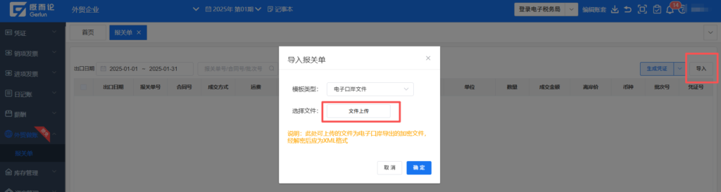 2、在弹出的文件选择窗口中,定位到从电子口岸解密后的 XML文件,选中并上传。