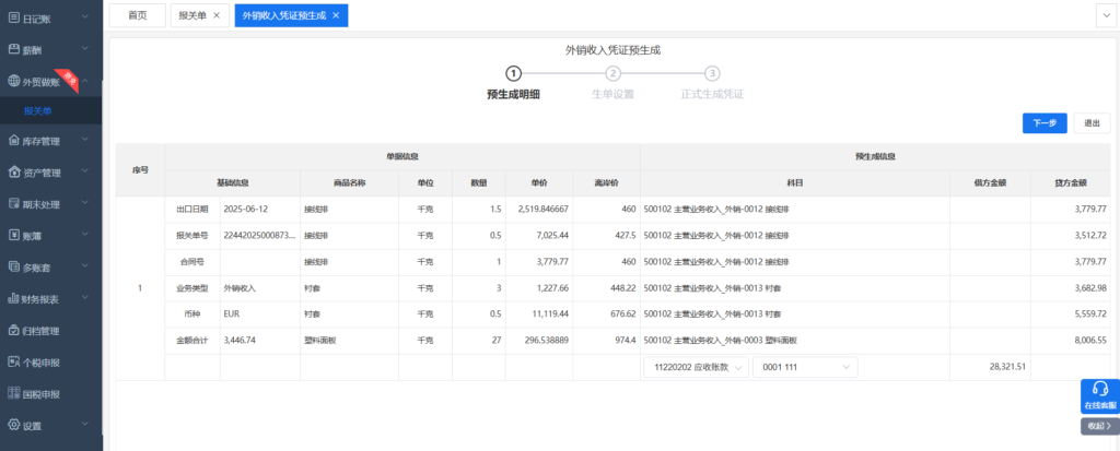 3、系统会弹出凭证生成预览界面,展示即将生成的凭证摘要、科目和金额。