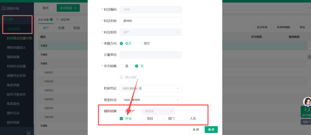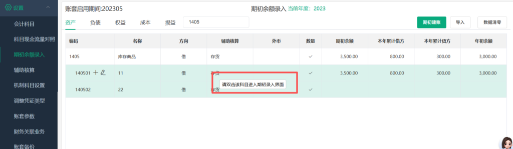选择需要取消辅助核算的科目(本文以1405库存商品科目为例),双击进入辅助期初余额录入。