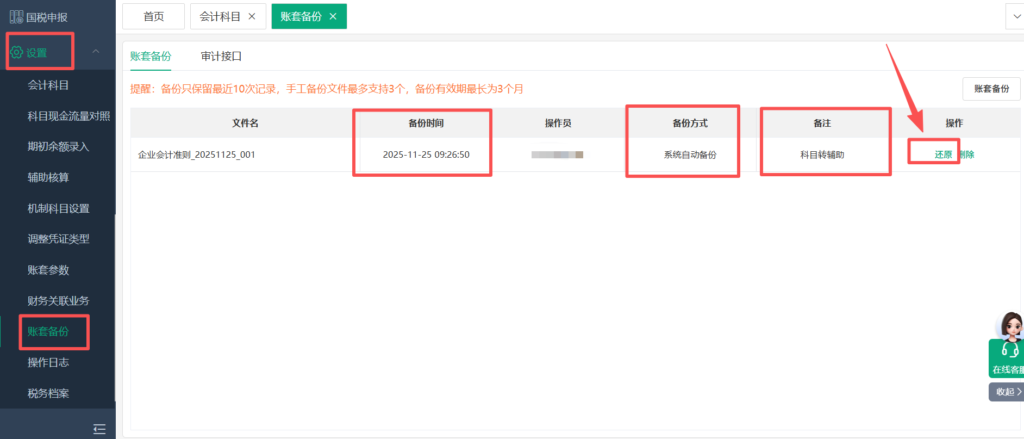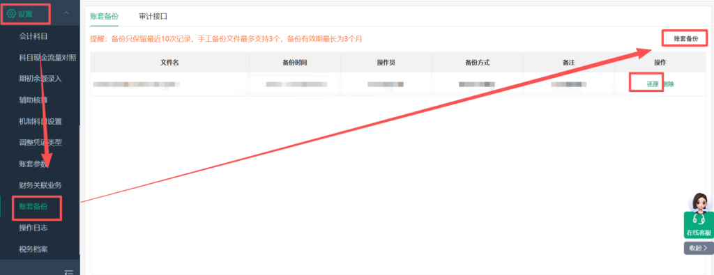 ①为防止数据改错,首先在【设置】-【账套备份】处对账套进行备份,若修改过程中数据出现错误则在【设置】-【账套备份】处对账套进行还原处理。