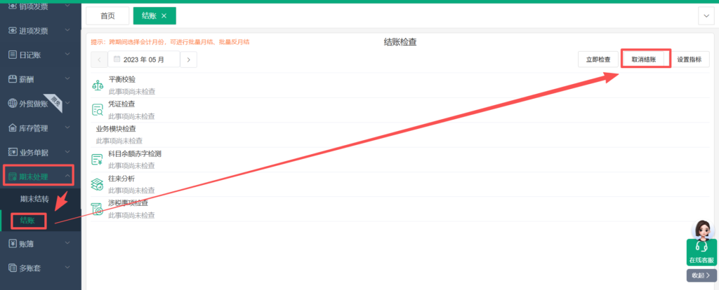 ⑦在【期末处理】-【结账】处将账套结账至需要月份。(若无法结账,检查是否点击了期初建账)