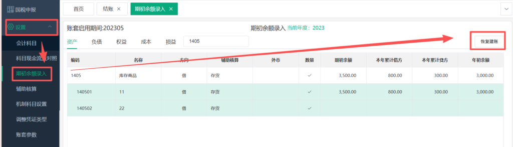 ③之后在【设置】-【期初余额录入】处点击【恢复建账】(若没有【恢复建账】检查是否已经反结账到期初)