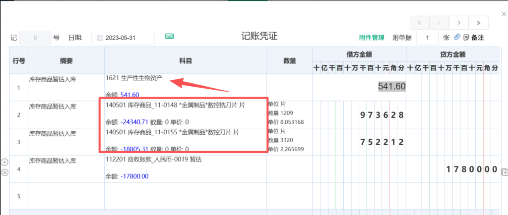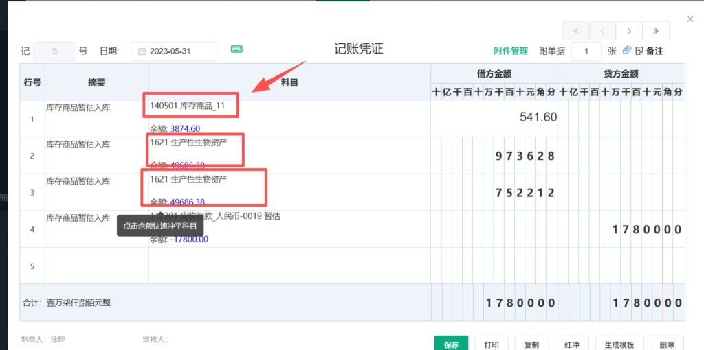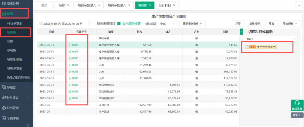 ③之后在【账簿】-【明细账】处修改需要取消辅助核算的科目的发生,选择对应发生凭证后将科目改至不常用科目(本文以1621生物性生物资产为例)建议截图保存数据方便后续恢复。
