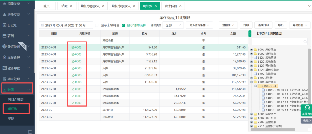 ⑥最后在【账簿】-【明细账】选择之前改动的不常用科目,将凭证改回。