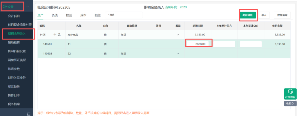 ⑤成功取消辅助后,在【设置】-【期初余额录入】中将之前的期初数据填回去,之后点击右上角【期初建账】。(若提示期初不平,检查填入数据是否有误)