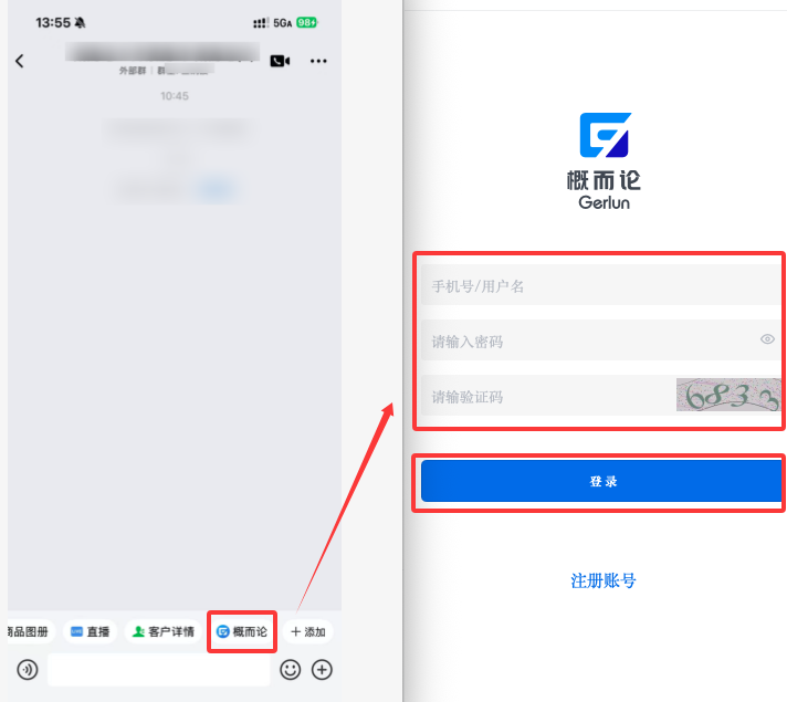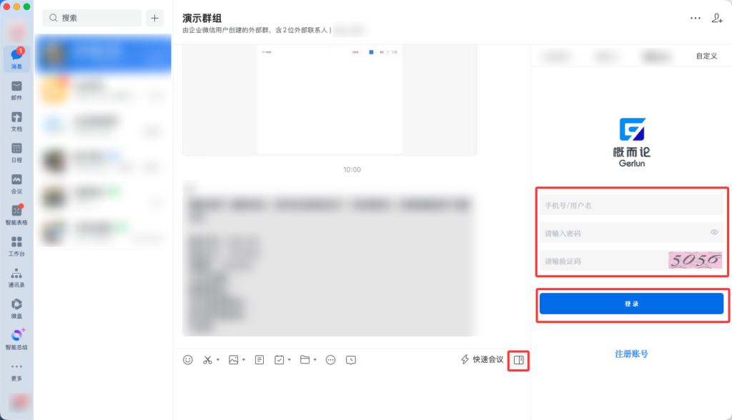 在企微外部群底部找到概而论,点击后进入应用,完成开票人员的概而论账号的登录。