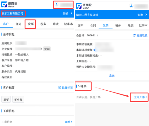 2、进入客户首页后,开票人员确认右上方用户名,以及左上方的账套是否正确,确认无误后,点击【立即开票】。