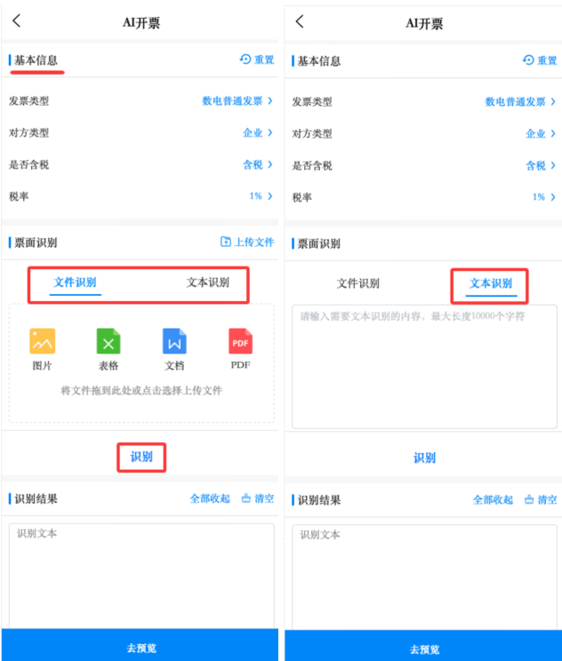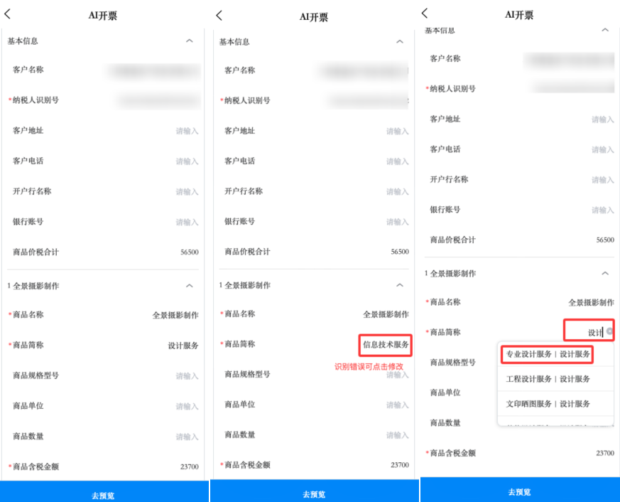 识别结果由发票头信息和发票明细信息组成,如识别结果有误,可直接修改,用户确认识别的发票头和发票明细数据无误后点击【去预览】进入下一步发票开具。