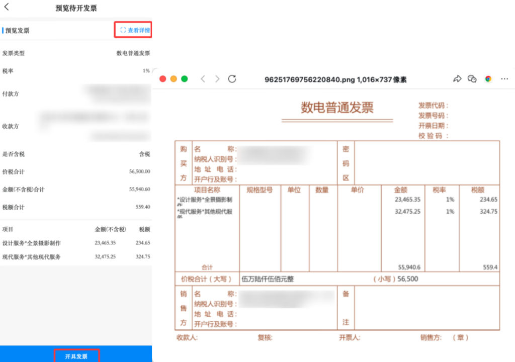 1、点击去预览后,将显示发票头和发票明细行信息,点击右上角查看详情,将生成一份发票预览图(未实际开具,仅预览发票内容)。