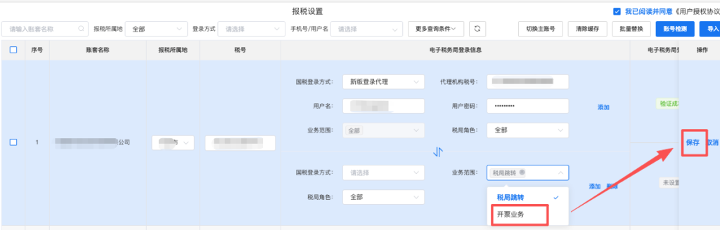 (1)账套的开票账号,默认是主账号,如需要将子账号设置为开票人员账号,需进入【报税设置】-【编辑】-【子账号】-【业务范围】添加“开票业务”后,点击保存,完成子账号的开票业务设置。