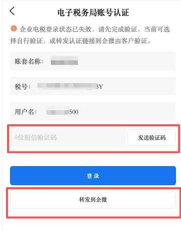 (2)如未登录税局,将自动进入电子税务局账号认证界面,如开票人员可自己登录,发送验证码录入后点击登录,即可完成认证。如开票人员无法登录,需要企业的其他人员验证登录,可点击【转发到企微】将登录的链接信息发送到企微群,由企业的其他人员完成登录后通知开票人员,即可继续进行开票操作。