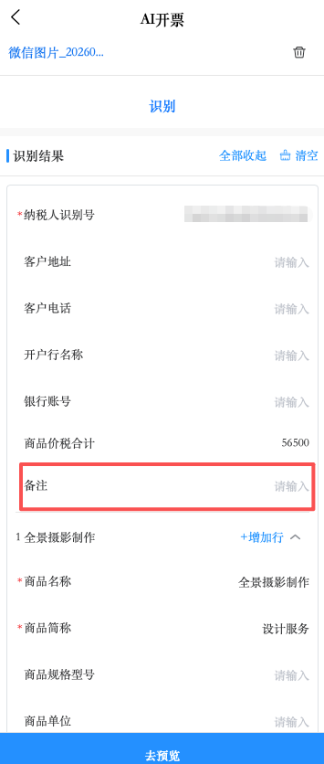 (1)识别结果由发票头信息和发票明细信息组成,如识别结果有误,可直接修改,用户确认识别的发票头和发票明细数据无误后点击【去预览】进入下一步发票开具。