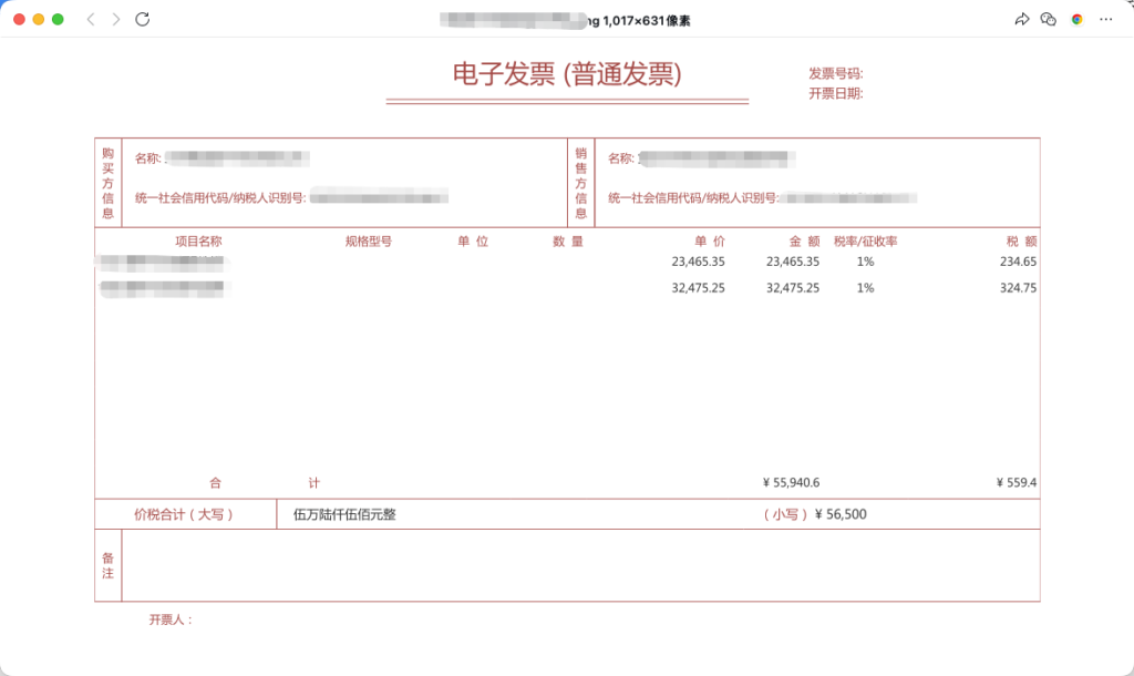 (3)当前最多可识别100条发票明细数据,如明细行较多,识别的时间会较长,请耐心等待,后续将持续优化可识别的发票明细条数。
