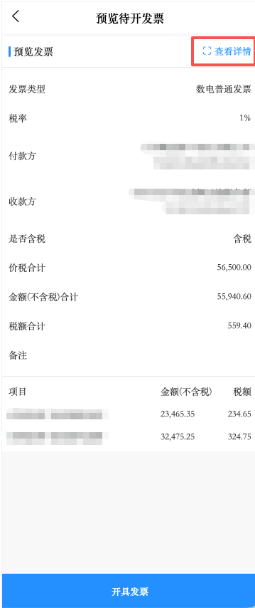 1、点击去预览后,将显示发票头和发票明细行信息,点击右上角查看详情,将生成一份发票预览图(未实际开具,仅预览发票内容,优化了预览样式)。