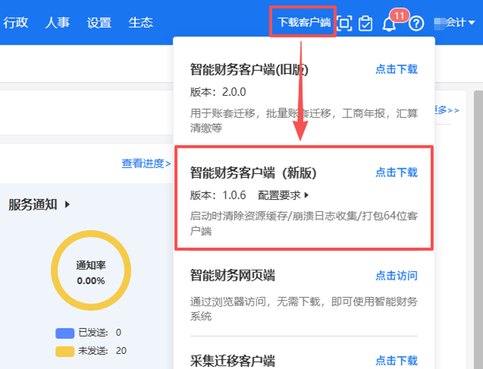 请在页面右上角【下载客户端】位置,下拉选择「智能财务客户端(新版)」 完成下载并安装。