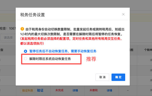 用于同一个税务账号发起的多个任务,身份切换次数上限后,自动暂停,用户可选择手动恢复任务,或在1小时后恢复暂停的任务。