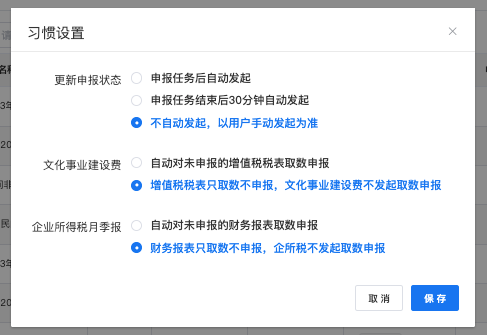 文化事业建设费:该选项与是否开启快捷申报设置无关,仅在用户发起的文化事业建设费的取数或申报任务后,判断前置的增值税税表是否在概而论系统内是已申报的状态。如果不是已申报的状态,且选择了第一项,则对增值税报表自动发起取数、申报任务,文化事业建设费也发起取数、申报任务;如果选择了第二项,文化事业建设费将不发起取数和申报的任务。