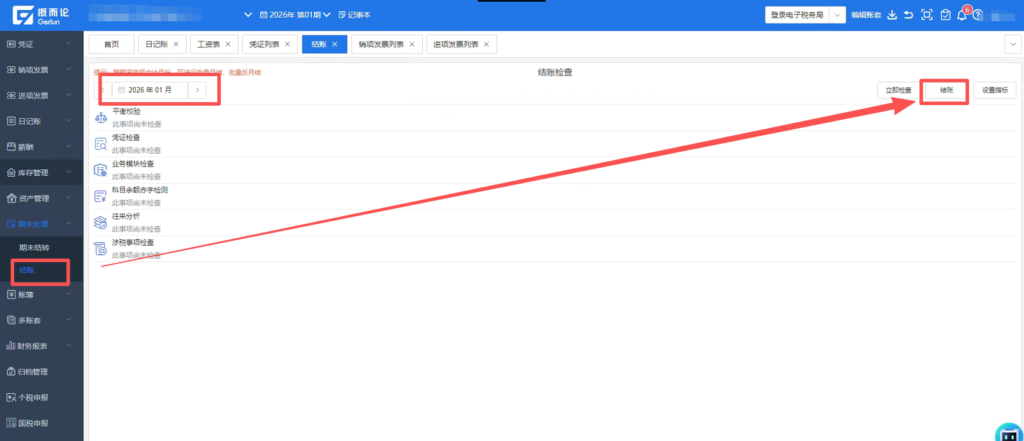 3.1指定好之后在【期末处理】-【结账】处结账到需要生单的时间。