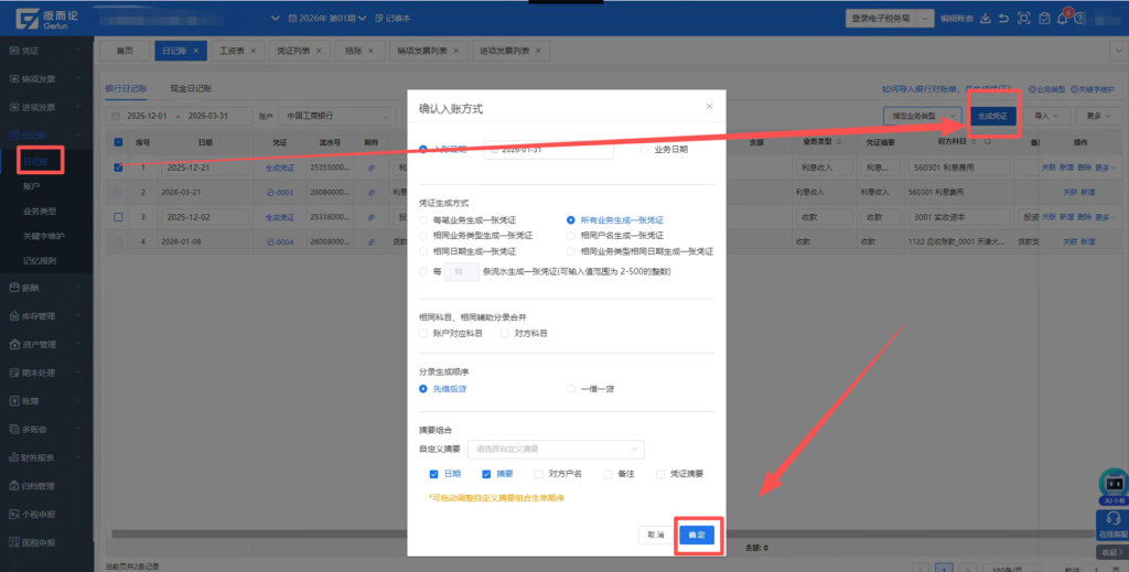 4.最后在【日记账】选择刚刚无法生成的流水,点击【生成凭证】生单。