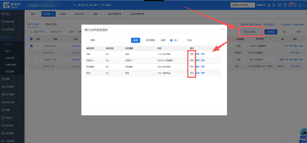 2.在【日记账】右上角点击【指定业务类型】,选择需要入账的科目。