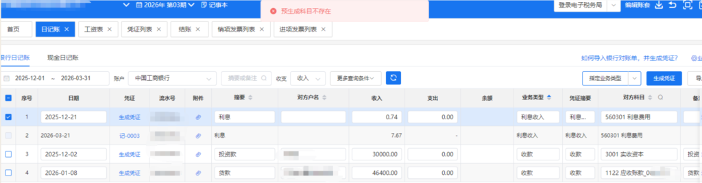 当日记账跨年生成时会出现提示:预生成科目不存在