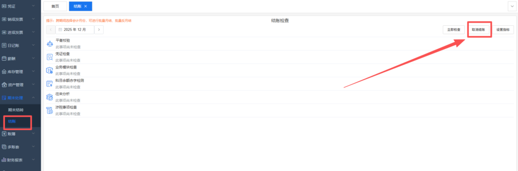 1.在【期末处理】-【结账】处反结账到流水发生年份(以25.12流水为例,则需要反结账到25年)。