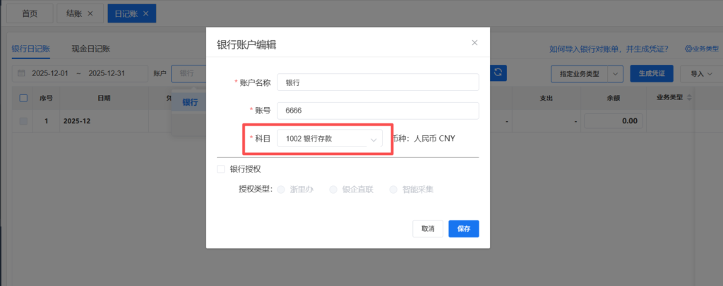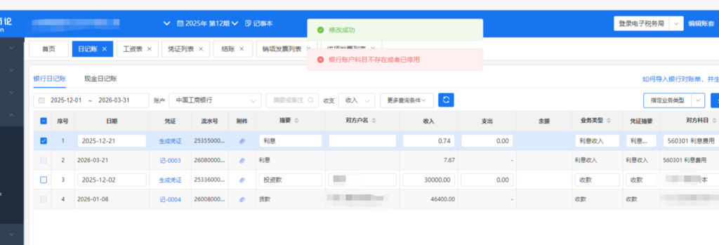 3.2若出现报错:银行账户科目不存在或已被停用,查看 “3.3” ;若未出现报错直接跳到 “4”