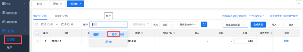3.3在【日记账】银行一栏选择【修改】,选好银行对应【科目】,再去【期末处理】-【结账】